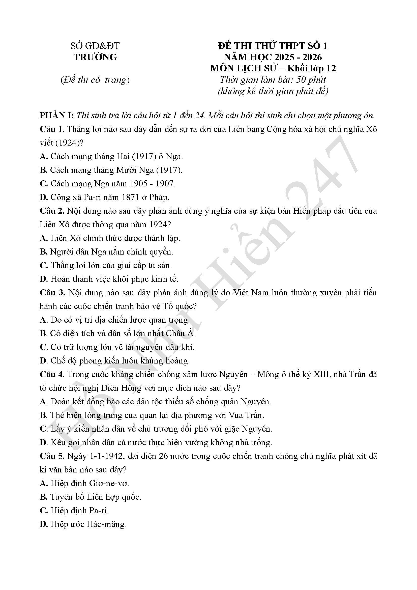 Đề số 1 | Bộ 30 đề thi tốt nghiệp THPT 2025 môn Lịch Sử 12 bám sát cấu trúc đề thi minh họa | Có lời giải chi tiết