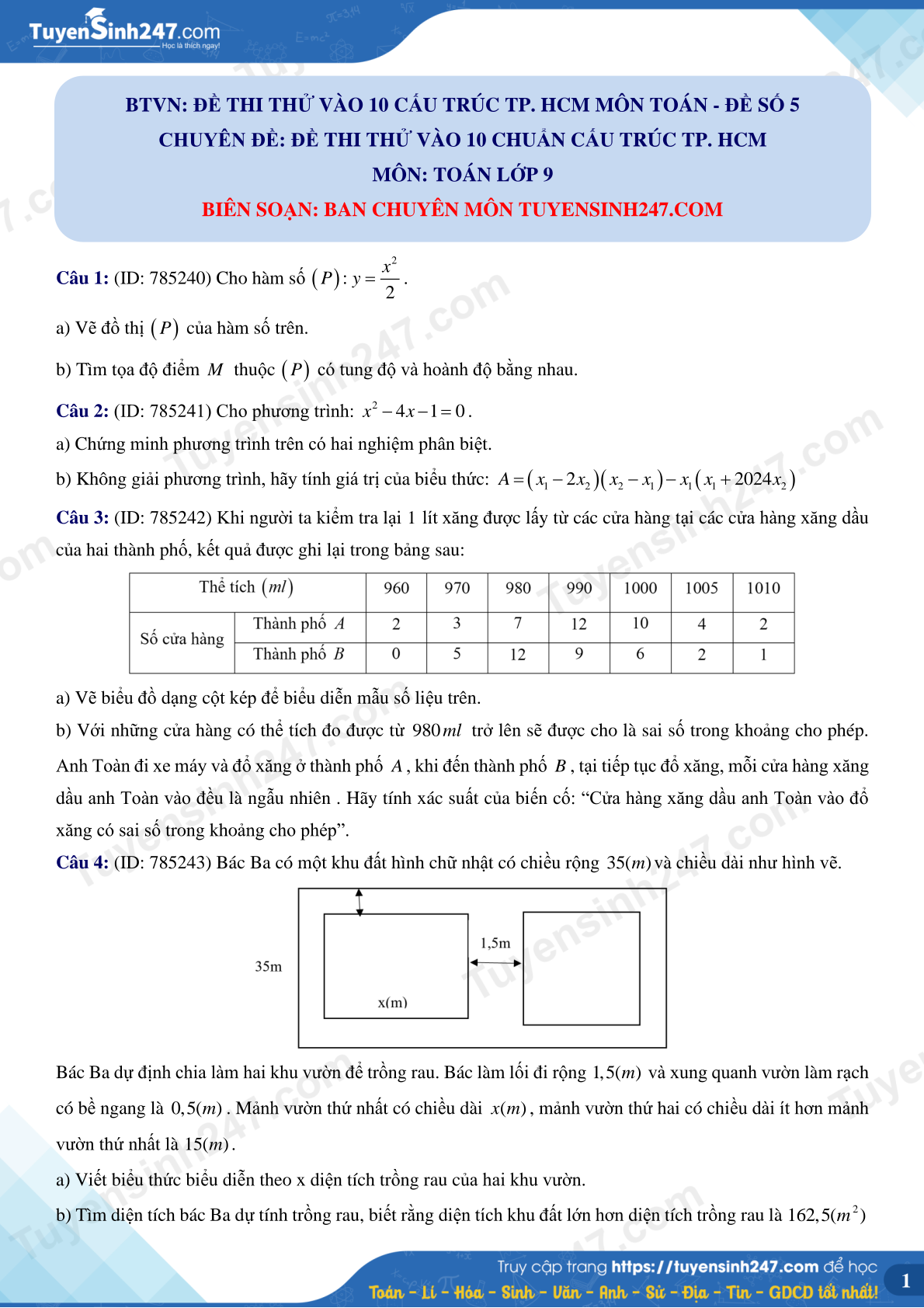 Bộ 20+ đề thi thử vào 10 môn Toán Hồ Chí Minh bám sát chương trình mới, được cập nhật liên tục, đảm bảo đủ số lượng ít nhất 20 đề trước kì thi chính thức Tuyển sinh vào 10 Hồ Chí Minh